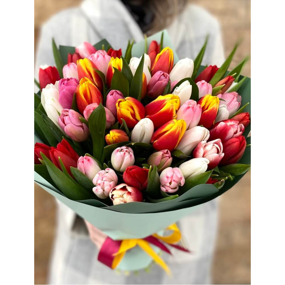 51 свежий тюльпан, символизирующий радость, оптимизм и новую жизнь.