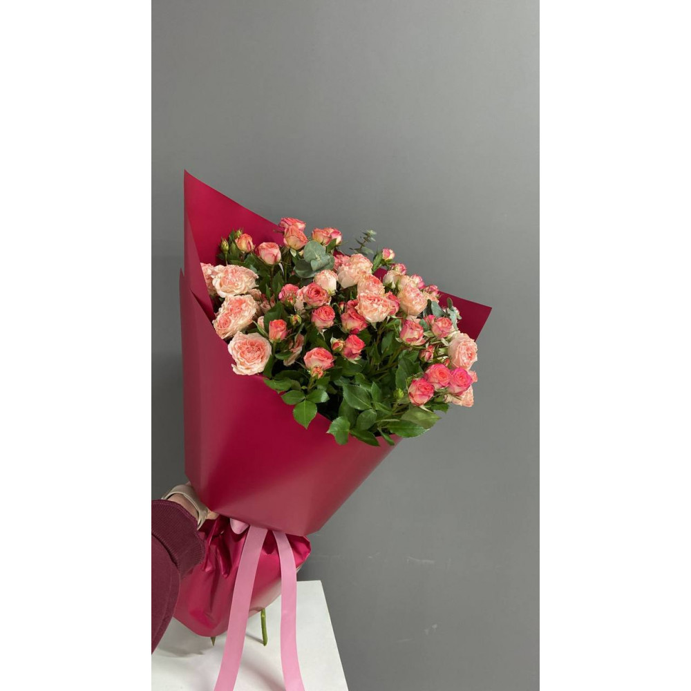 Стильное оформление: Каждый элемент букета оформлен с особой заботой, чтобы подчеркнуть естественную красоту спрей роз и создать гармоничный и нежный образ.