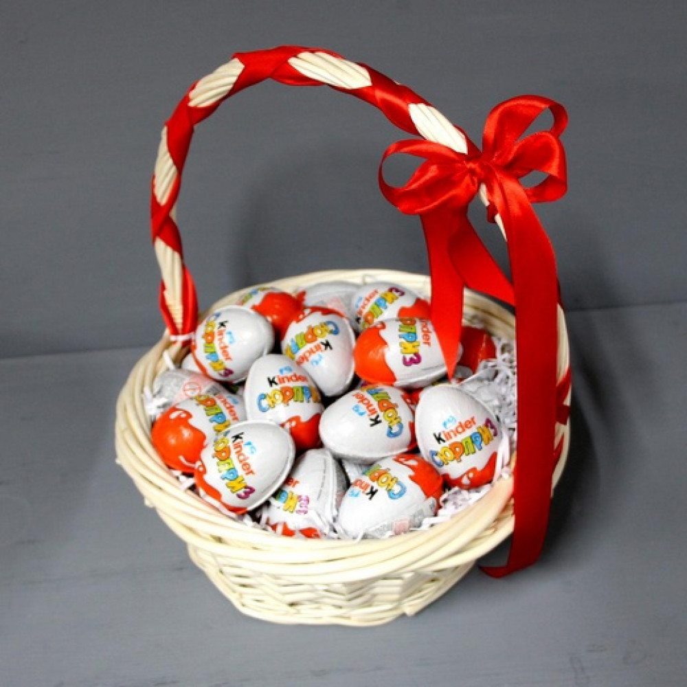 Состав Корзины "Киндер": Kinder 5шт, Kinder Choco Bons 2шт, Kinder Delice 6шт, Kinder Chocolate 100г 2шт